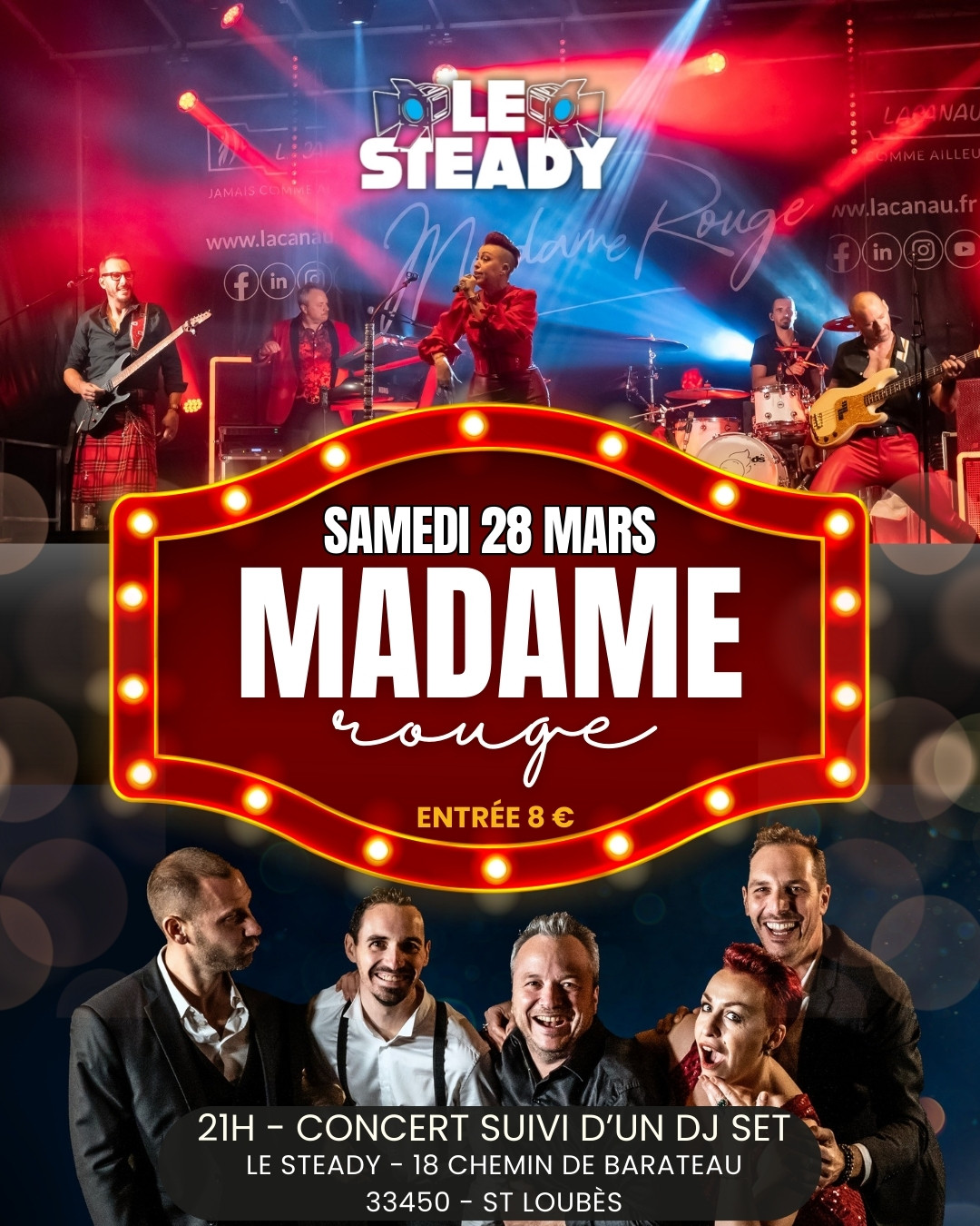 Ce samedi 28 Mars, le Steady vous propose une soirée concert avec "MADAME ROUGE"