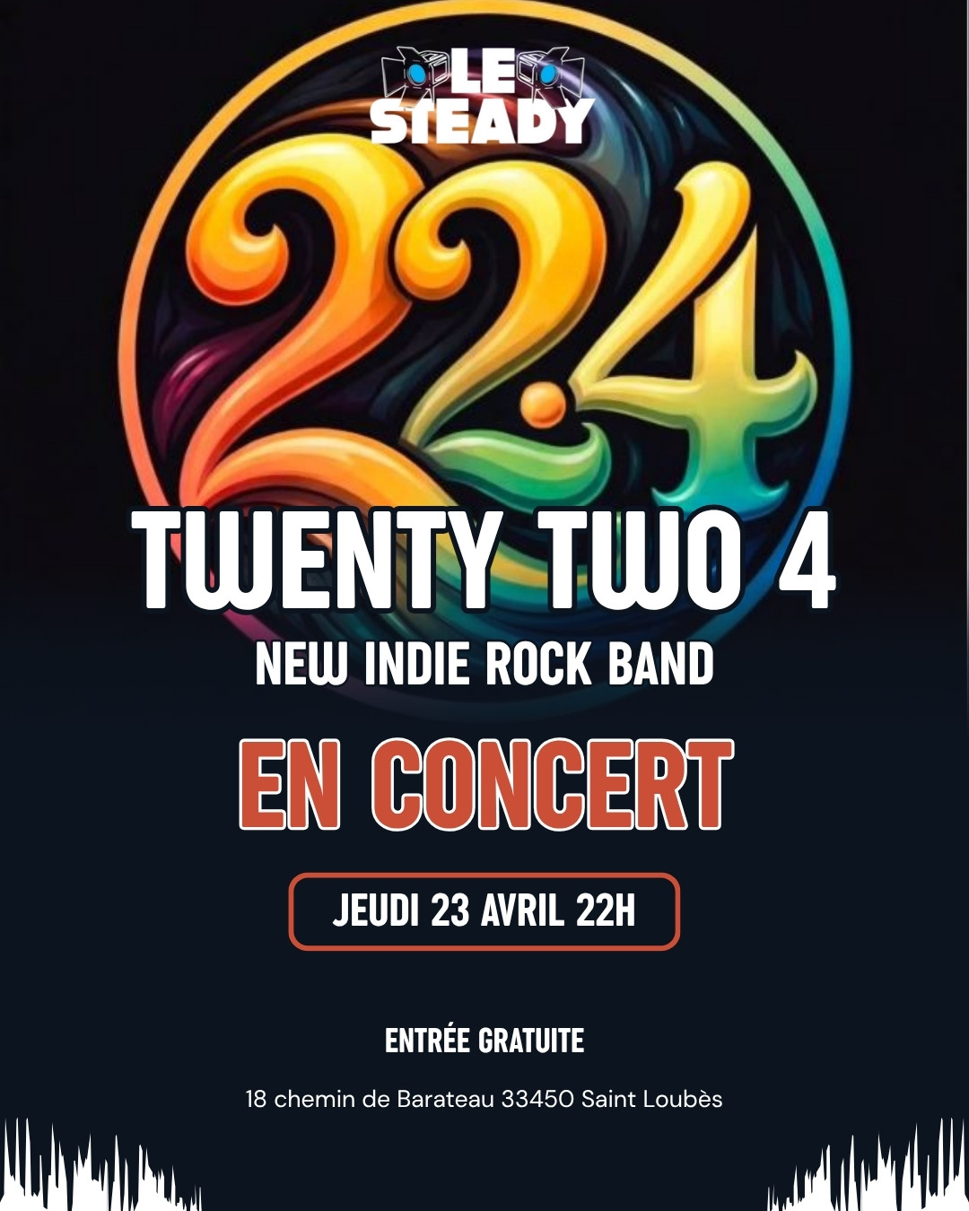 Ce jeudi 23 Avril, le Steady vous propose une soirée concert avec le groupe "TWENTY TWO FOUR".