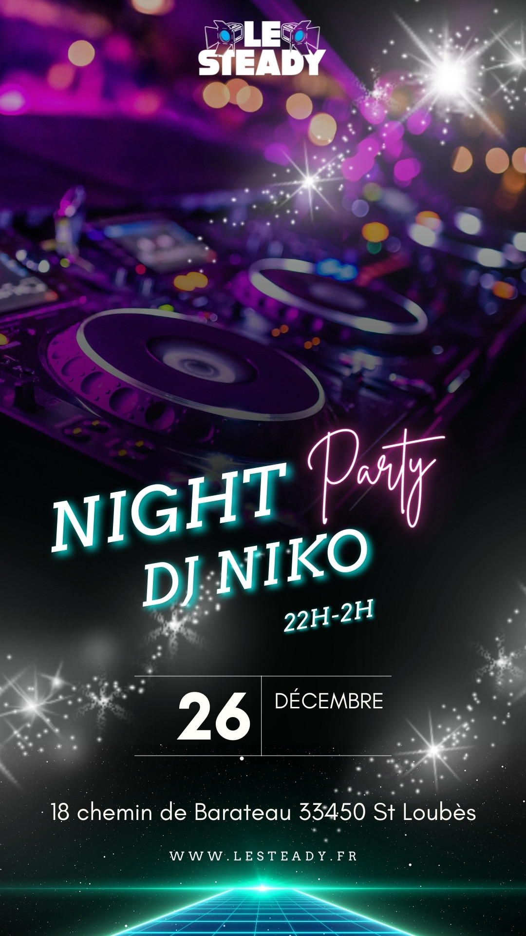 Ce vendredi 26 décembre, le Steady vous convie à une soirée Party mix de 22h à 2h avec DJ NIKO ! Toutes danses avec playlist des années 80 à aujourd'hui !